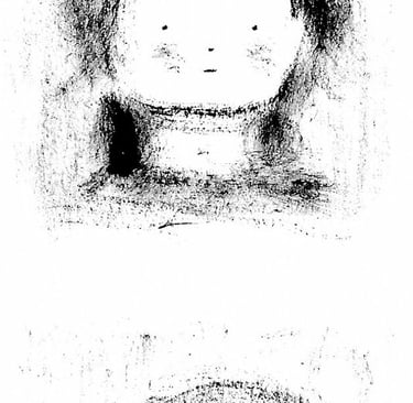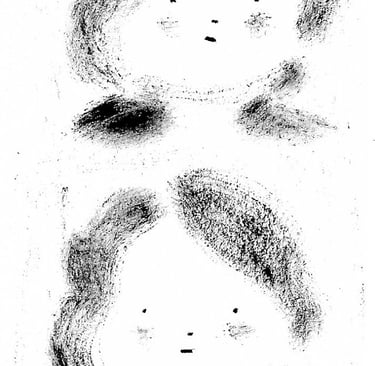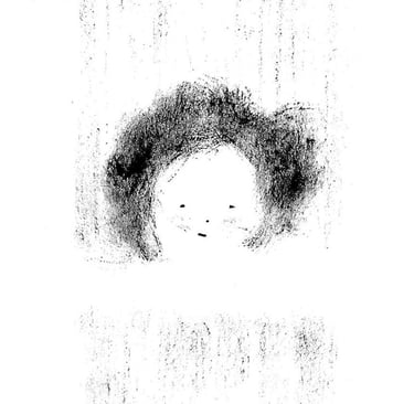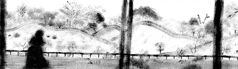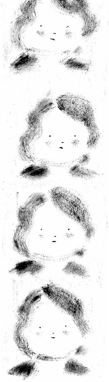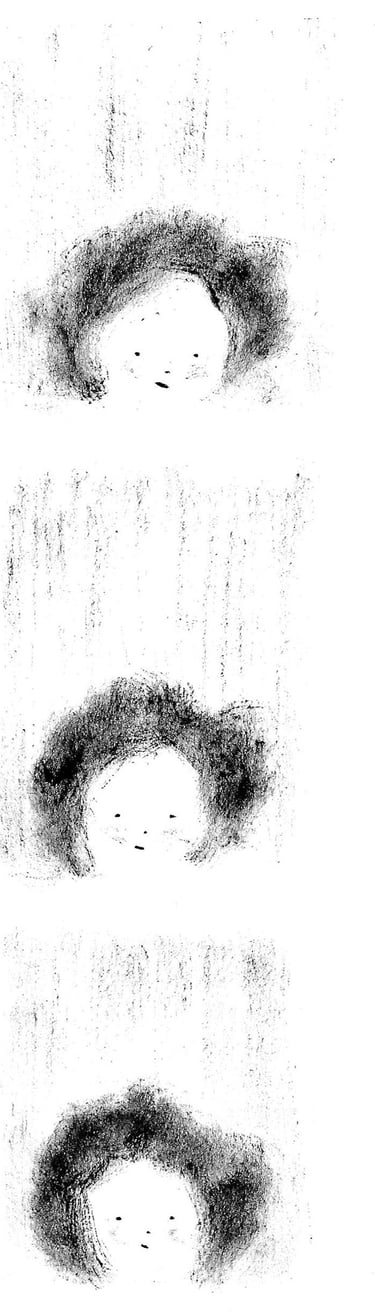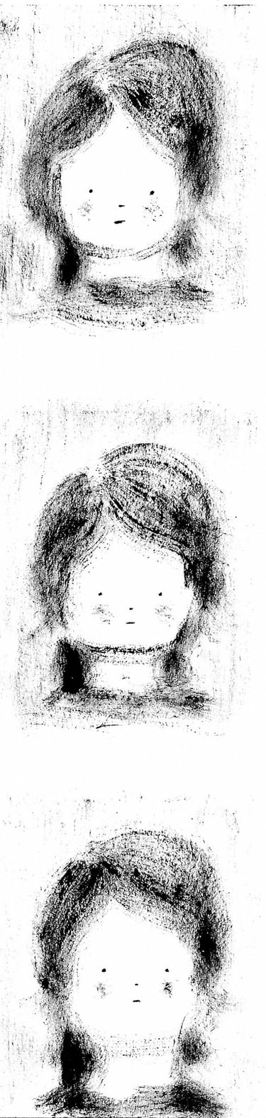 La texture cotonneuse de la peinture sèche, proche du fusain, souligne la note nostalgique et introspective. Sur la feuille blanche, comme dans une chambre noire, les ''photographies'' de lieux marquants apparaissent.